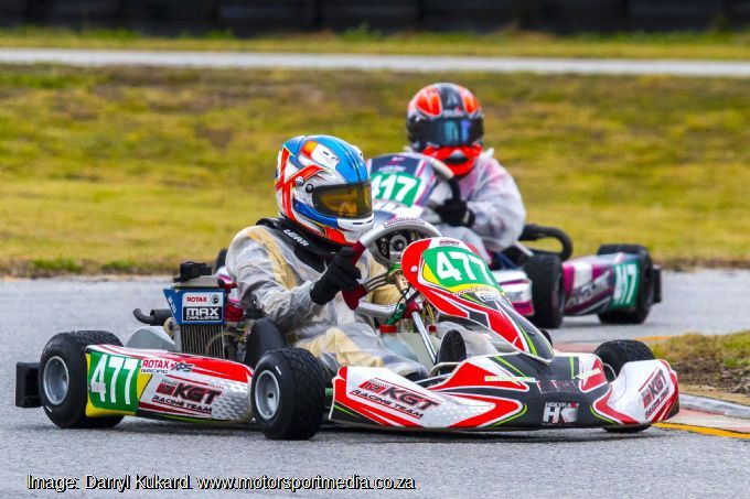 Elder brother and SA Junior Max champion Charl had a more difficult weekend after qualifying a strong second. “We made a few wrong calls on our wet set-up and my kart was not ideal to start with and I ended up third in race 1,” Charl explained. “Then we went the wrong way with gearing and race 2 was even more of a challenge, but I hung in for fifth. The final was looking better but the track came to the three guys behind me and I ended up fifth again.