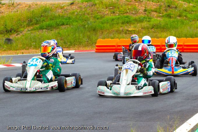 Aqil Alibhai enjoyed an untroubled run to all three under-15 high school Junior Max wis to leave class rookies Nikolas Roos and Troy Snyman to tussle for second. Roos set a FK Junior Max lap record at 1:09.958 as he came from behind to pip Snyman for second but he would drop to third due to a nose cone penalty, but Nikolas made no mistakes to take second behind Alibhai in race 2. Roos however went out on the first lap of the final, leaving Snyman to take second in spite of a nose cone penalty to clinch second for the day behind Alibhai and ahead of Jordan Brooks, who took three fourths, Tyler Robinson who popped up third in the final and Roos sixth from Thando Mathebula and Joao Magalhaes.