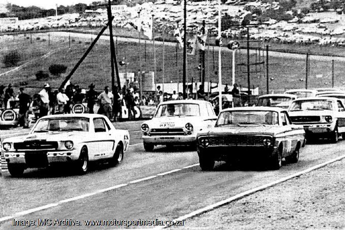 The 1965 South African Saloon Car Racing season opened in grand style in a dream showdown between Jackie Stewart's Lotus Cortina, Paul Hawkins' Willment Ford Galaxie and South Africa's enfants terrible, van Rooyen and Swanepoel. The race proved a close-fought affair, with the Galaxie winning by a tenth of a second from Stewart, Basil and Koos, as the four Fords made for the best racing of the day by far.