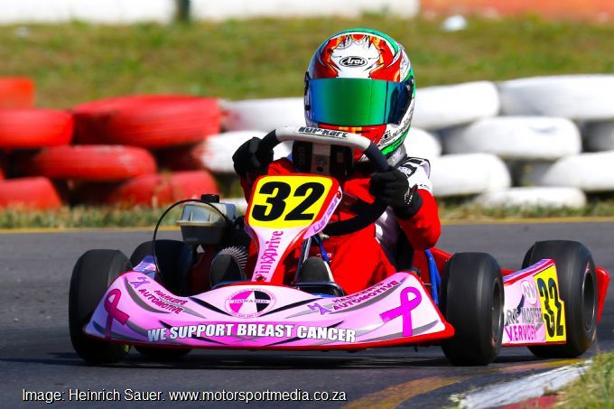 Little Luan Mostert completed his first full season of karting by not only taking third in the Western Province under-8 Cadet championship race at the last turn at Killarney on Saturday, but the young man also made a huge statement by turning up with his kart all dressed up in pink to celebrate his AMV team’s R5000 donation to Pink Drive in support of Breast Cancer. Bastion Laerskool Brackenfell Grade 1 kid Mostert then went on to move up to clinch third in the championship with a fine third place on the day.