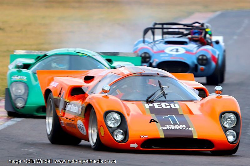 Seef Fourie Junior took victory in the opening Le Mans Prototype, Sports, GT and Trans-Am race with Jonathan du Toit‘s Chevron B8 and Larry Wilford’s glorious Lola T70 Coupes in chase after Niel Lobbs similar car faded. James Temple’s Daytona coupe followed from Peter Bailey’s Porsche 917, Warren Lombard’s Cobra, Porsche man Andre van der Merwe and Mark du Toit and Djurk Venter’s Daytona Coupes. Wilford bounced back to take heat 2 from Jonathan du Toit, Bailey, Lombard and van der Merwe. Mark du Toit followed from Venter, Ten Doeschate and the delayed Temple and Fourie.