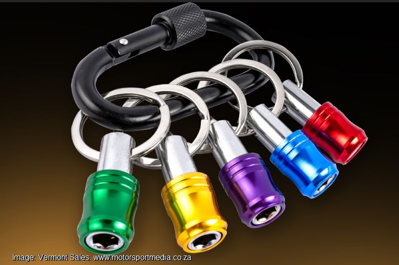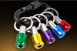 Featuring a fast Snap-it System with a push & pull ring sleeve and lockable carabiner, each anodised clip is colour coded to easily identify which bit or tool is attached to it. Featuring  an aluminium carabiner and bit holder sleeve, the quick-change bit holders, body and key ring are crafted from zinc plated steel.