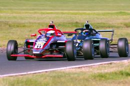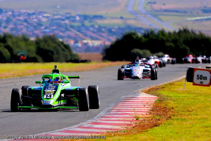 Chase Haskins followed in seventh from Polome, Fourie and Anastasia Gerasis in tenth, Kajee, Mohlahlo and a delayed Gianna Pascoal as Kent Swartz joined Khoza in retirement. Ian Schofield utterly dominated the Kent action from Vos, Morris, and van Weely. With the race 2 grid taken of drivers’ second best qualifying times, Shrien Naidoo started on pole from Aqil Alibhai and Mikel Bezuidenhout.