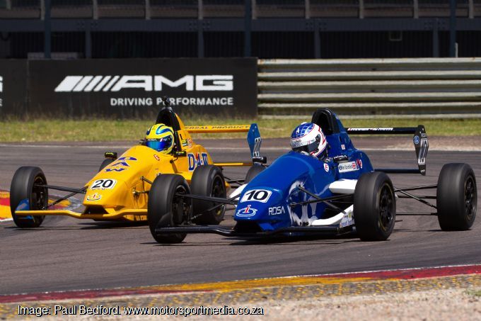 Cape Town lad Andrew Rackstraw converted impressive practice pace into a pair of pole positions for the first two races by posting the two quickest qualifying laps aboard his Investchem/RDSA Mygale albeit just a tenth quicker than double series runner-up over the past two years, Nicholas van Weely’s Magnificent Paints & Hardware van Diemen in race 1. Andrew Schofield (Investchem Mygale) lined up third ahead of Tiago Rebelo (TRMS Mygale) and Gerard Geldenhuys (Abacus Divisions Mygale) in race 2.