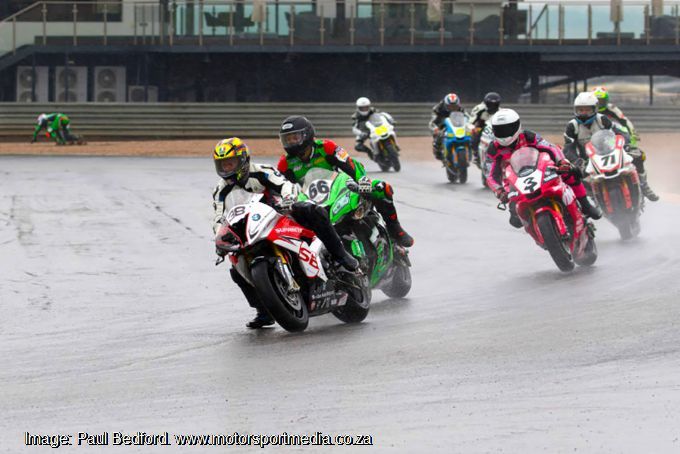 While the riders were doing their formation lap before the start of the first race the track was not completely wet but it was already very slippery. Wet tyres became the order of the day, especially after the race officials declared it a wet race and gave them an extra warm-up lap to come to grips with the conditions. An indication of what was to come came when Ivan van Niekerk lost the front end of his Harki Recon Engineering Kawasaki ZX10 under braking at the top of the hill before turn 5. His bike collected White as it slid along the track, unceremoniously dumping him onto the tar. While White was able to remount and take his place on the grid, van Niekerk’s race was over.