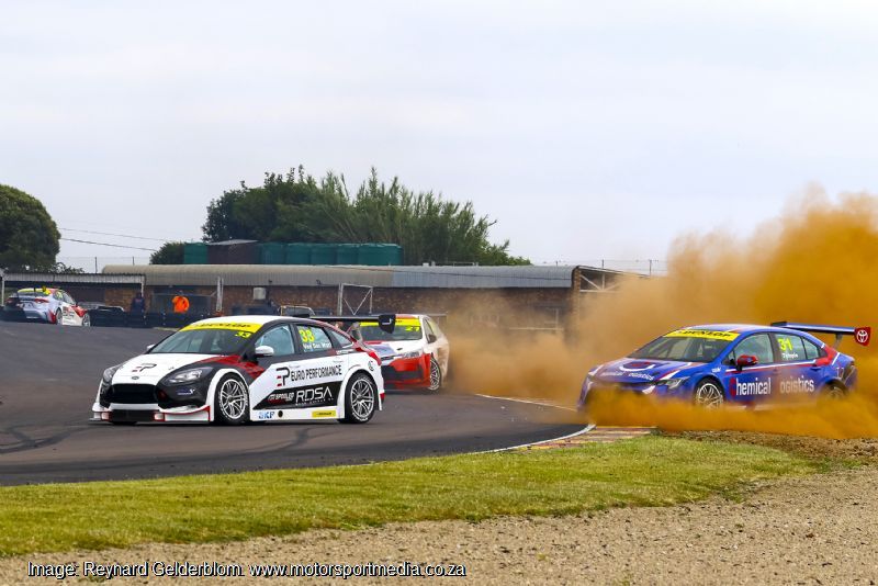 The race was red flagged and re-started without Temple as van Rooyen led the way from Wolk and a tussle between van der Watt, Mdkane and Lee Thompson’s Universal BMW 220i, when Temple’s Corolla amazingly returned to the track three laps after the start. The WCT team under Stuart Thompson had dragged the stricken car back to the pits, rapidly repaired the bent rear tie rod and dispatched Temple back into action.