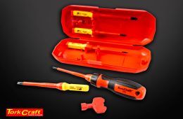 Ideal for Professional and DIY use when there’s electricity about, the five durable insert bits have chrome vanadium shanks VDE insulated up to 1000 volts, and chrome vanadium blades and tips. The precision black magnetic tips include three 100 mm slotted screwdriver heads, and a pair of 80 and 100 mm Phillips bits. Tork Craft cautions use within rated voltages.