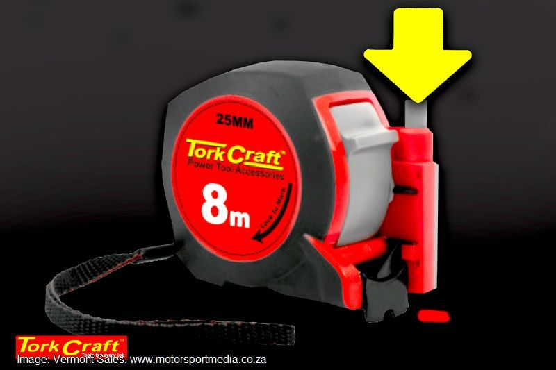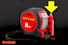 The 8 metre self-marking measuring tape features a 25 mm wide carbon steel blade, a reinforced precision hook and manual blade lock. Simply line it up, measure and press down on the cartridge at the required mark, and you have your red ink marker set. Learn more about these and many more high value, best quality tools at www.torkcraft.com.