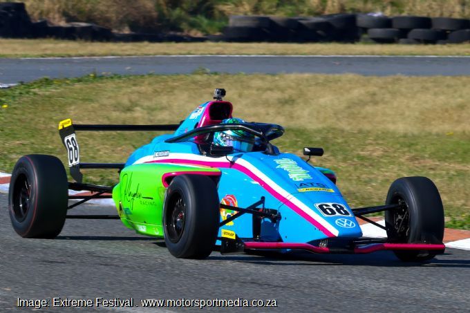 Ndzalo Khoza’s Ducted Solutions Makasela MSA4 was next up from Nicholas van Weely’s Investchem CLR version in tenth, debutant Anastasia Gerasis in her Apex Cordset car and Investchem CLR lad Simphiwe Mohlahlo. Formula Ford Kent legends Ronald van Weely, Ian Schofield, Rick Morris, and Allen Meyer closed the grid in their tread-shod classic non-wing machines.