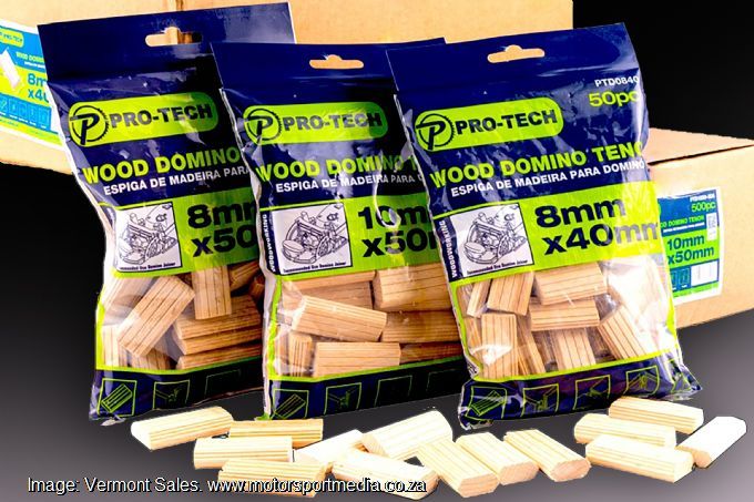Now also available in new-look packs, rather than just the old school jars they have come in until now, contractors, DIY man and hobby enthusiasts alike have a far broader choice in how they get their Pro-Tech domino tenon biscuits. They are now available in 4 by 15, 20 and 23 millimetre, and 6 by 40, 8 by 40, and 10 by 50 millimetre sizes in new look packets in a variety of 50 to 1000-piece option.