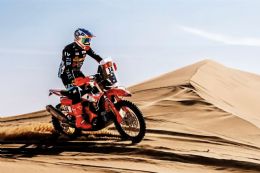 It was all change behind Benavides 100 km later, with van Beveren up to second from a fast recovering Sanders, Branch, Cornejo and South African Michael Docherty, who popped up as the Rally 2 leader with compatriot Bradley Cox’ Sherco on the fringes of the top ten. First on the road, Brabec languished in 16th as Benavides made off up front, leaving Sanders and van Beveren scrapping for second with Branch, Docherty and Cornejo in chase.