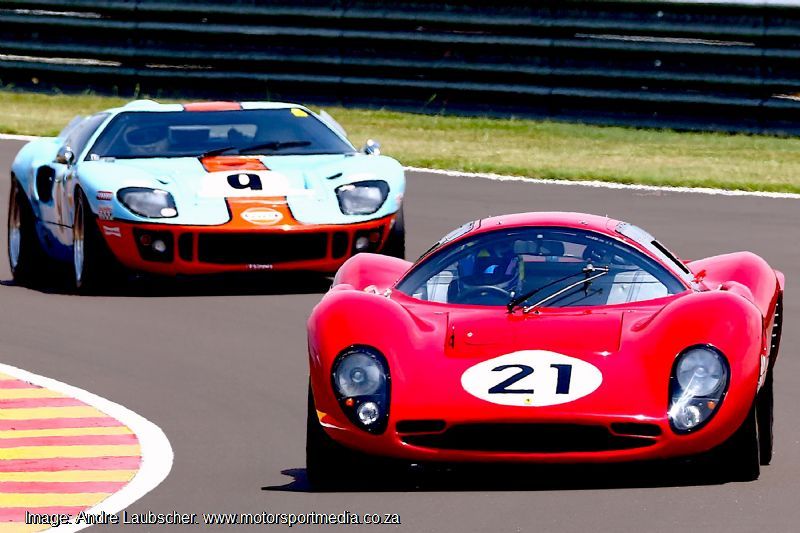 Rui Campos’ more modern Shelby Can Am proved a touch too hot for Lola T70 trio, Larry Wilford’s MK3B, Mark du Toit’s Coupe and Neil Lobb’s MK3B to handle in the first Legends of the 9 Hour Sports and GT race. Son Keegan Campos beat Andre van der Merwe’s similar Porsche 911 RSR to the GT win in fifth and sixth from Jonathan du Toit‘s Chevron B8 and Seef Fourie Jr.’s Lolette. Rui Campos went on to do the double from Wilford, Mark, and Jonathan du Toit and Fourie Jnr, GT men George Avvakoumides’s Herman Kluge Porsche RSRs and Swede Janne Kling’s genuine Ford GT40.