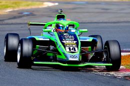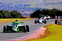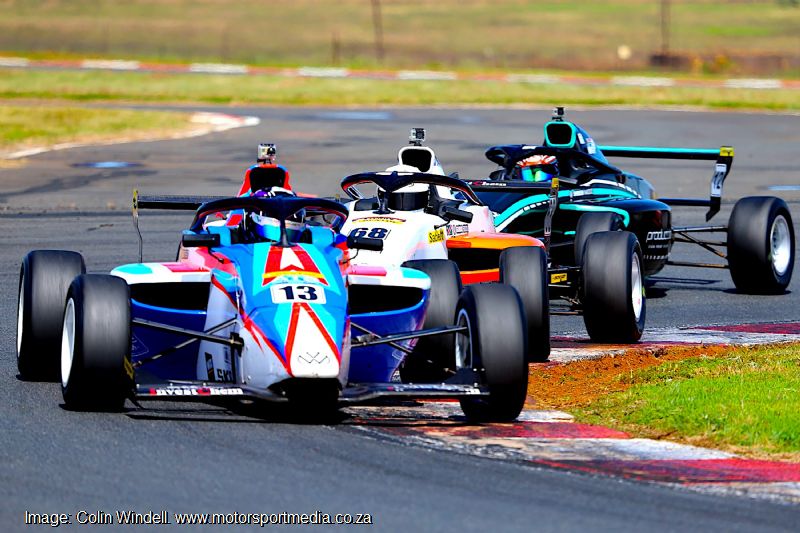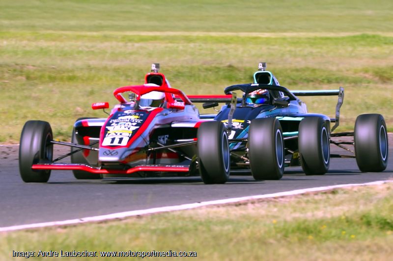 Chase Haskins followed in seventh from Polome, Fourie and Anastasia Gerasis in tenth, Kajee, Mohlahlo and a delayed Gianna Pascoal as Kent Swartz joined Khoza in retirement. Ian Schofield utterly dominated the Kent action from Vos, Morris, and van Weely. With the race 2 grid taken of drivers’ second best qualifying times, Shrien Naidoo started on pole from Aqil Alibhai and Mikel Bezuidenhout.